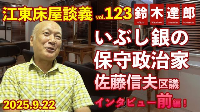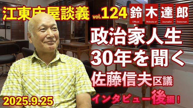 江東床屋談義123 信頼ある保守政治家! 佐藤信夫区議インタビュー 前編 江東区自民党で8期務めたいぶし銀の江東区議 佐藤信夫さんのインタビューです。なかなか珍しい、矜持ある保守政治家であることが、インタビューから伝わります。 鈴木達郎 X→ https://twitter.com/apflsuzuki 江東区疑惑まとめ→ https://youtu.be/V22pN6j4s4w?si=J5r7kjdQxBmpaNO3 江東床屋談義は、無責任に外野から、江東区のみならずいろいろな政治の話題をかたるシリーズです(笑) コメント議論大歓迎ですが、失礼だったり慇懃無礼な感じのコメントは消していきます。 #江東区 #東京15区 #江東床屋談義