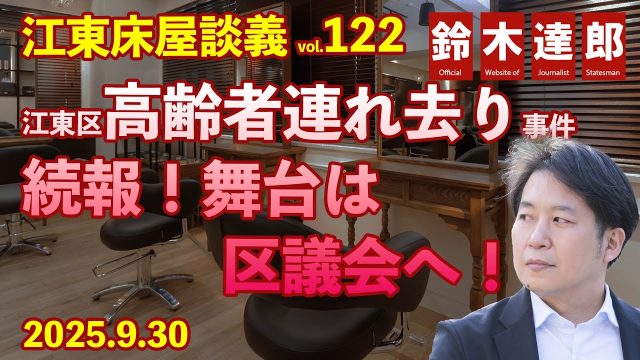 江東床屋談義125 江東区高齢者連れ去り事件 続報!舞台は区議会へ! スローニュースの元記事 https://slownews.com/n/n230ca1d45ed9 高野区議のX→ https://x.com/takano_hayato38/status/1958702683197747416 二瓶区議のX→ https://x.com/NiheiFumitaka/status/1957701981663031784 鈴木達郎 X→ https://twitter.com/apflsuzuki 江東区疑惑まとめ→ https://youtu.be/V22pN6j4s4w?si=J5r7kjdQxBmpaNO3 江東床屋談義は、無責任に外野から、江東区のみならずいろいろな政治の話題をかたるシリーズです(笑) コメント議論大歓迎ですが、失礼だったり慇懃無礼な感じのコメントは消していきます。 #江東区 #東京15区 #江東床屋談義